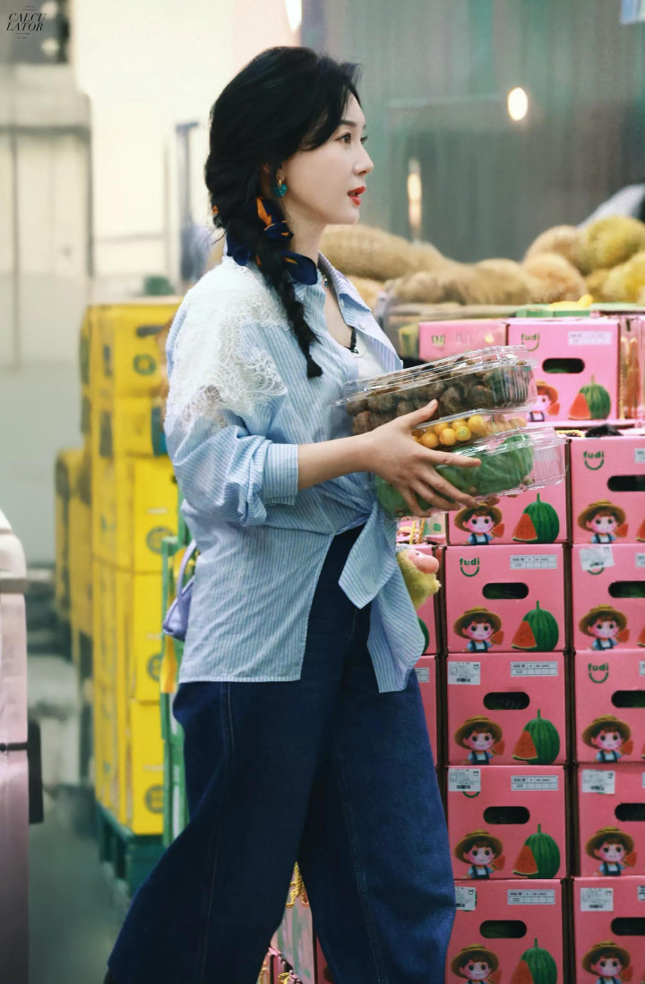 陈数的这套搭配,看似简单却藏满细节,每一处设计都精准戳中中年女性的穿搭需求。上身的蓝色条纹衬衫,没有选择普通的通勤款,而是加入了蕾丝装饰元素,温柔感瞬间拉满;V领设计巧妙露出锁骨线条,既显脖颈修长,又避免了衬衫的沉闷感;宽松版型能轻松藏住腰腹赘肉,日常穿着舒适无束缚,而将衣角塞进高腰牛仔裤的小技巧,更是一秒拉长身材比例,显高又显利落。